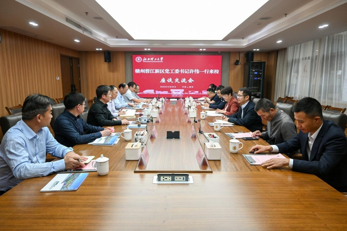 10月20日,赣州蓉江新区党工委书记许伟一行来校交流,并在三江校区(东园)濂溪楼三楼1号会议室召开区校合作座谈会。校党委书记刘祖文,校长、中国工程院院士葛世荣出席会议。校党委办公室、校长办公室、科学技术处、国内合作促进中心、土木与测绘工程学院等相关职能部门及学院负责人参加会议。会议由校党委副书记徐志峰主持。