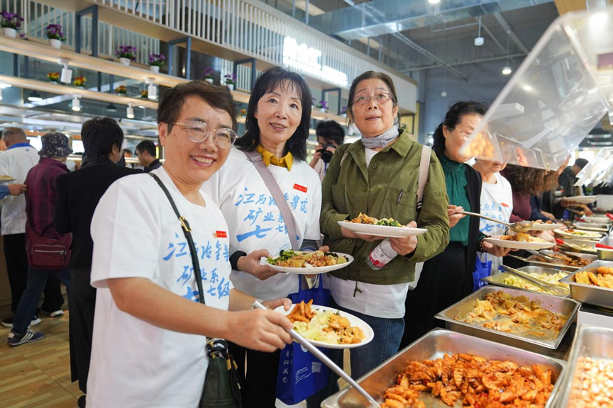 重回校园,八角塘、采矿楼、体育场这些老建筑,依旧是校友们心中最鲜明的符号。阔别多年的校友们相拥问候,鬓角的风霜难掩眼中的热忱,一句句“老同学,好久不见”瞬间拉近距离。他们身着统一纪念衫,在图书馆前整齐列队,镜头定格下这跨越数十载的重逢瞬间。