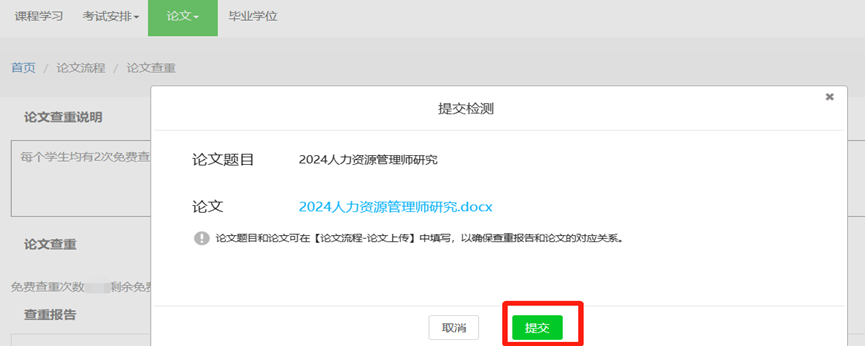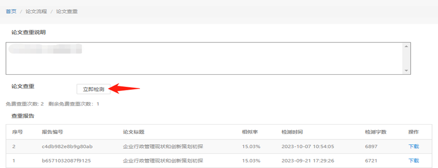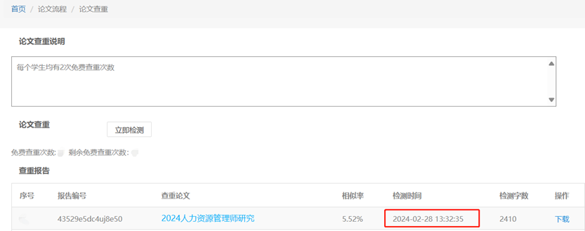 【注意】每名学生2次免费查重机会,请各位同学谨慎使用查重次数。