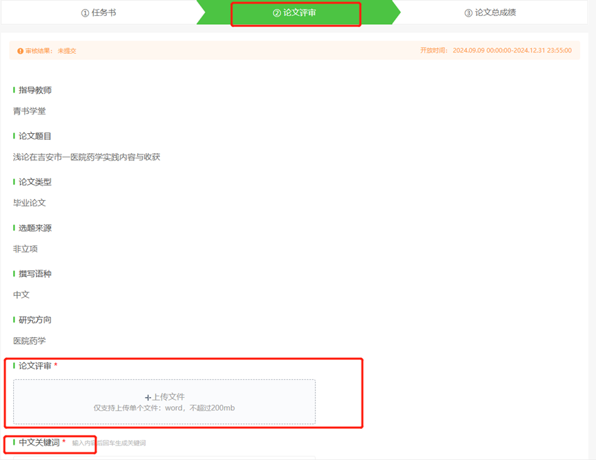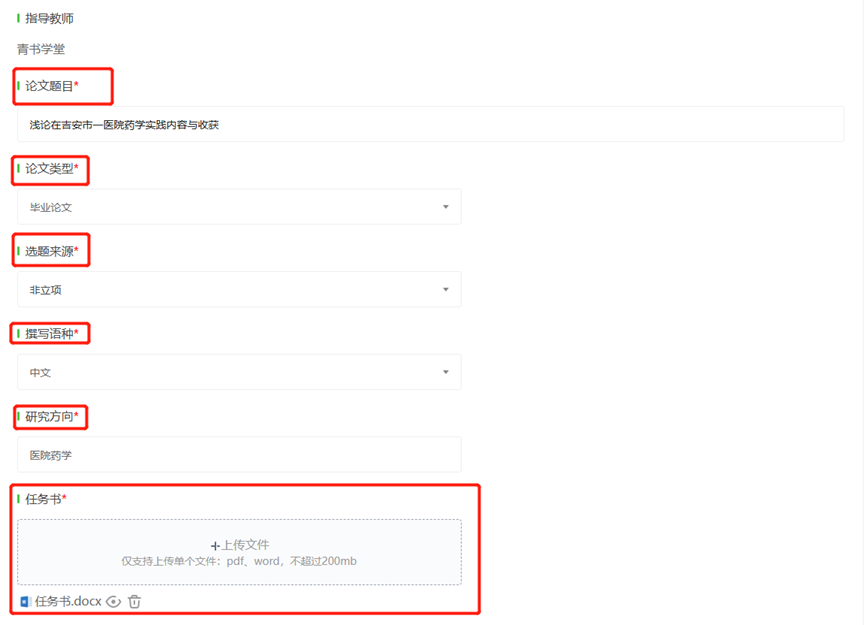 论文提交前,须先提交任务书(如下图),按要求与自身情况填写论文的基本信息并上传任务书,上传完毕后,联系指导老师进行审核,审核通过后方可提交论文并查重。