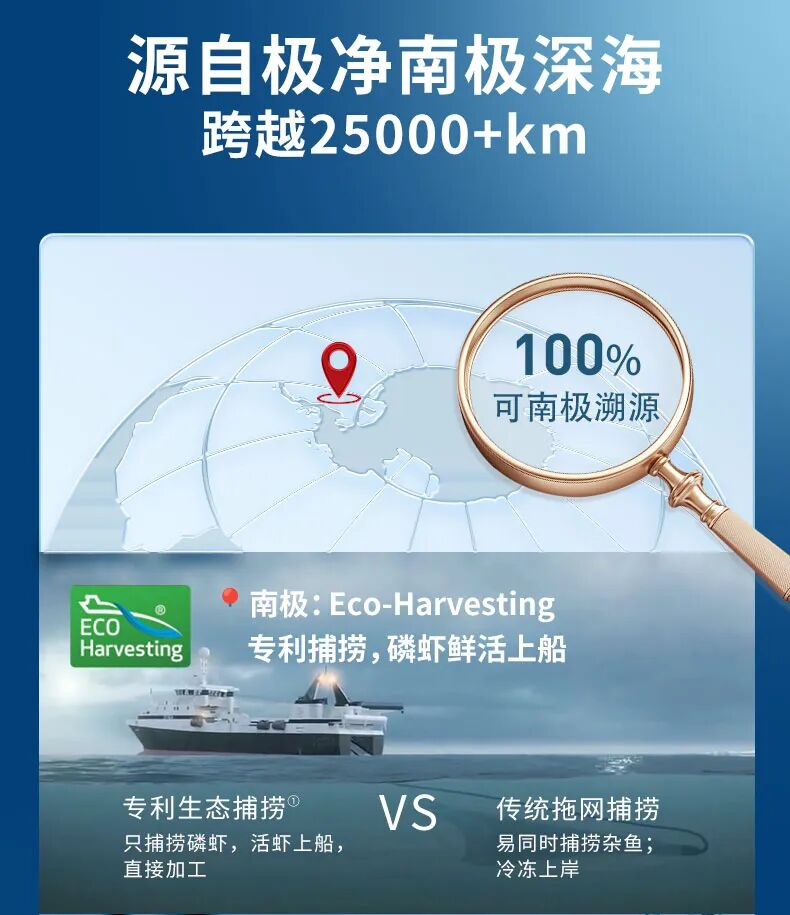 为保障原料纯净鲜活,船队需穿越16000公里航程、克服西风带风浪,采用挪威专利生态捕捞技术仅捕磷虾[3],活虾上船24小时内加工,尽力保留营养活性。