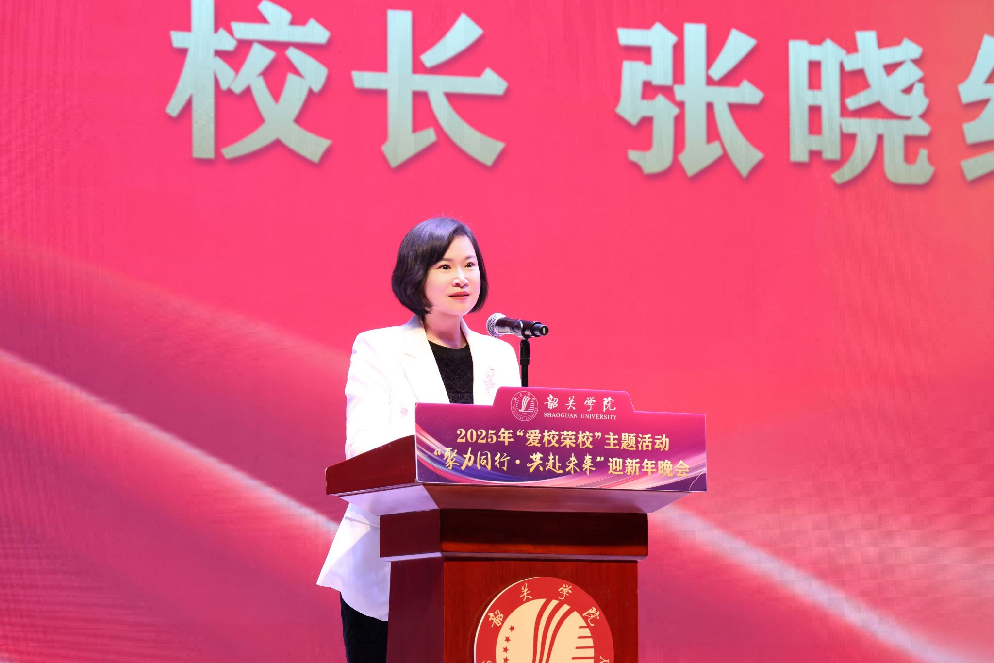 会上,张晓红致新年贺词。她代表学校向每一位韶院人致以崇高的敬意,向每一位关心支持参与学校发展建设的朋友表示衷心的感谢。她指出,2025年,是“十四五”规划收官之年,也是学校“全面深化改革年”“合作发展建设年”。全体韶院人紧扣“强国建设、韶院何为”的时代命题,以改革破局,以合作聚力,书写了一份亮点纷呈的“韶院答卷”,奏响了高水平应用创业型大学的奋进之歌。