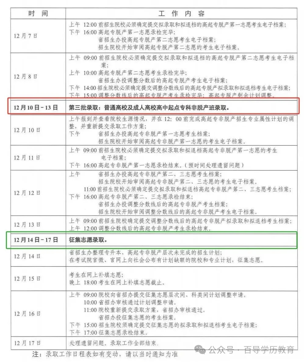 12月14日整理专科起点本科、高中起点专科非脱产层次院校招生计划缺额,并向社会公布;12月15日考生在网上补填志愿;12月16日—17日为征集志愿录取时间。