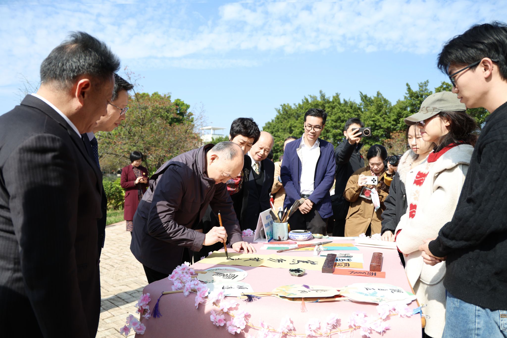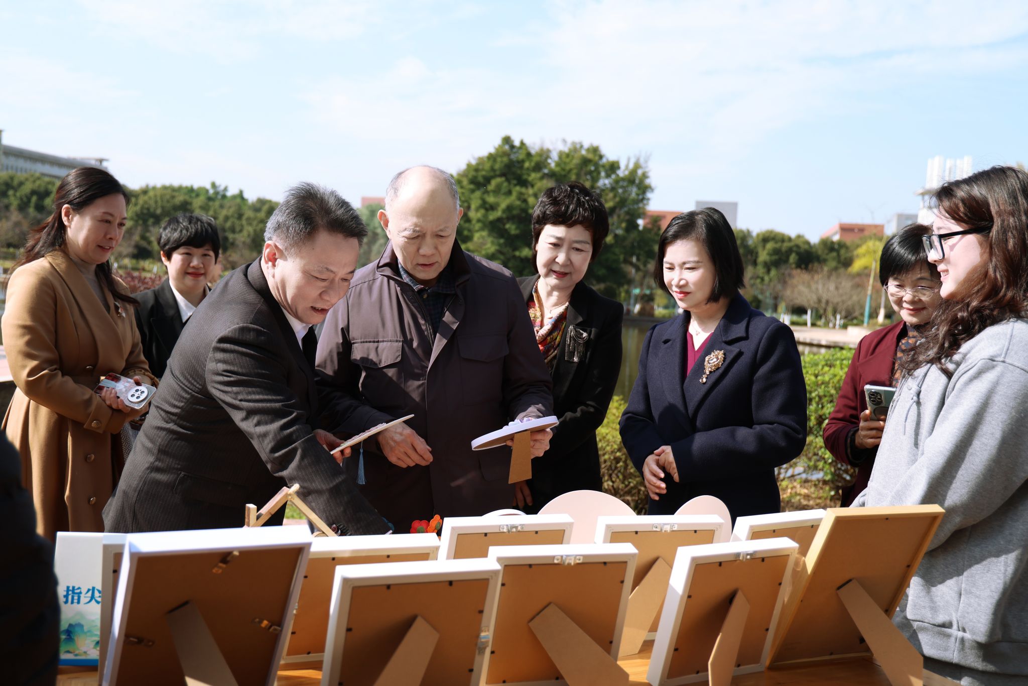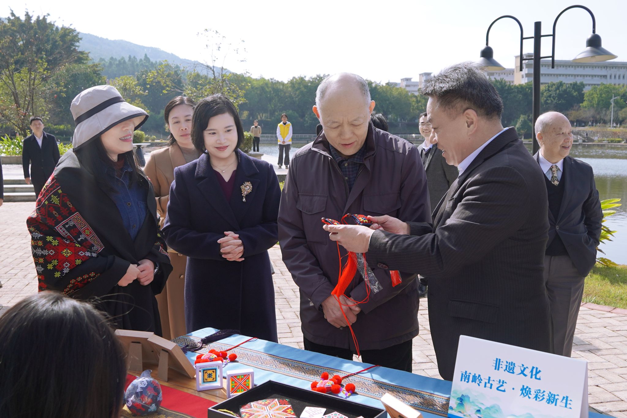漫步英东樱花园、霍公亭,霍震寰一行实地考察校园生态规划与人文建设。亭台映景、草木含情,每一处景致都承载着霍氏家族对教育事业的赤诚与对韶院学子的期许。在大学生多维素质(非遗文化)展示区,霍震寰与学生亲切交流,尽显对学子的殷殷关怀。