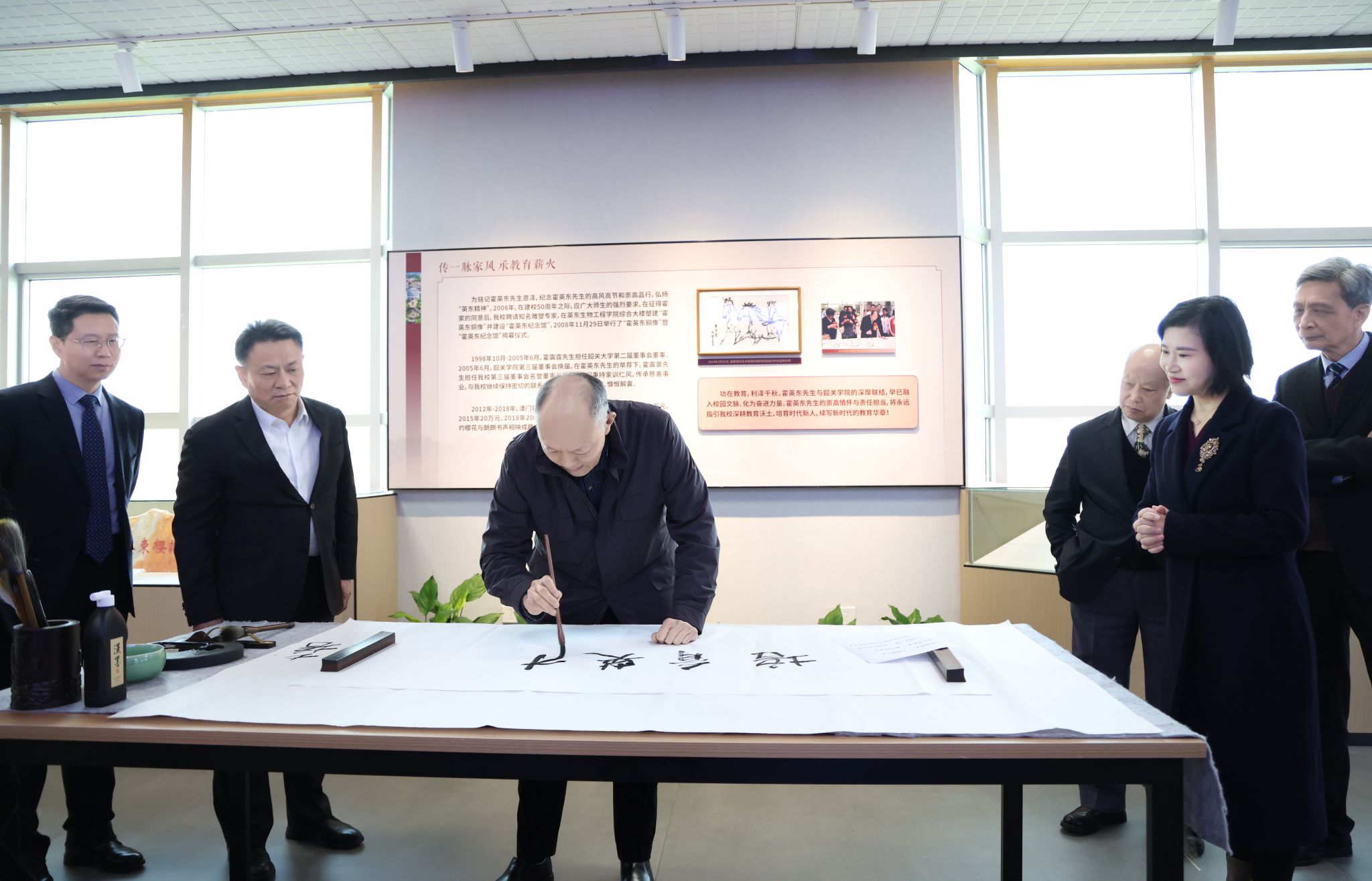 霍震寰挥毫泼墨,题写 “笃行致远”“培育英才”
