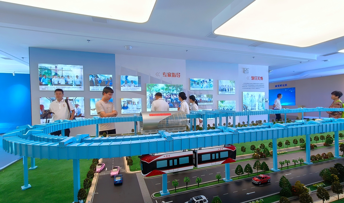 三江校区:在校史馆泛黄的合影前驻足,科技创新馆的尖端成果引来阵阵惊叹,“看!这是永磁悬浮技术应用于空轨车辆模型!一种新型悬挂式磁浮车辆”江丽指着学校最新科研成果激动不已。