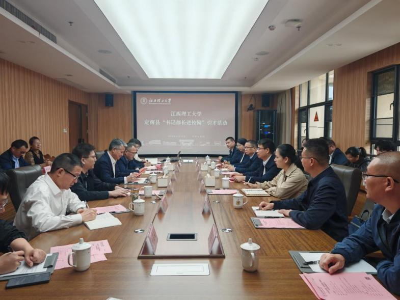10 月 29 日,定南县委常委、组织部部长刘成成一行来校开展“书记部长进校园”引才活动,并在三江校区(东园)濂溪楼 2 号会议室举行校地合作交流座谈会。校党委常委、副校长董冰岩出席座谈会。国内合作促进中心、组织部、科技处、矿业工程学院、体育与艺术学院等学院与部门负责人共同参加会议。