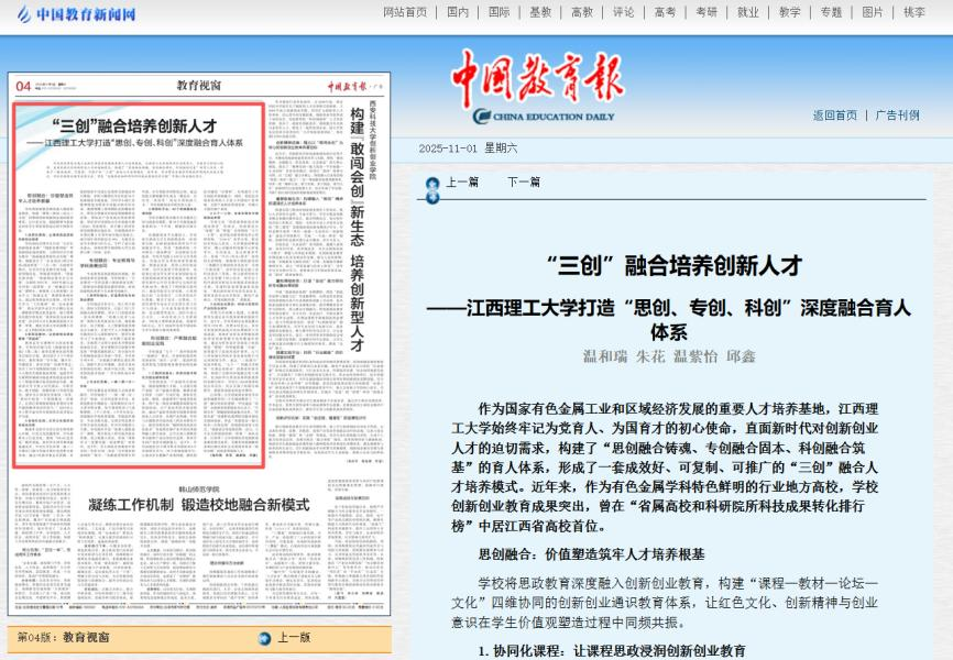 1.《中国教育报》:“三创”融合培养创新人才——江西理工大学打造“思创、专创、科创”深度融合育人体系