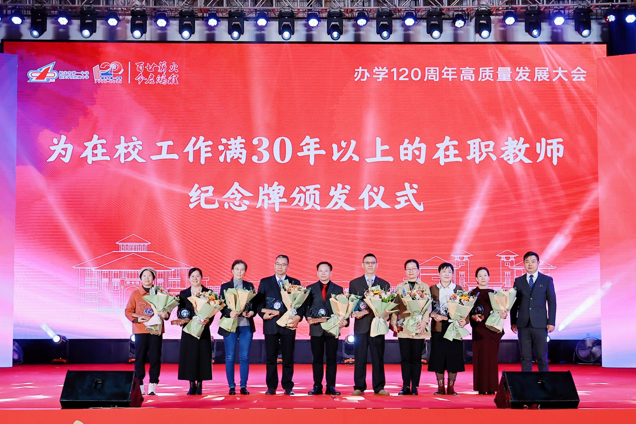 大会现场播放了在职教师代表录制的工作感言视频,陈伟、谢展云为在校工作满30年以上的在职教师颁发纪念牌,致敬他们深耕杏坛的坚守与奉献。年轻教师向老教师献花,传递“薪火相传”的深厚教育情怀,彰显尊师重教的优良传统。