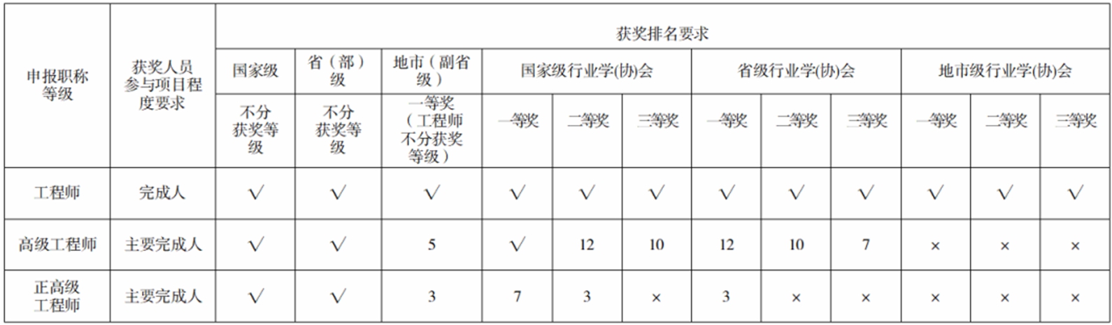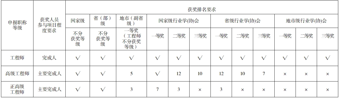 13. 申报工程师、高级工程师、正高级工程师职称的获奖项目参与人员的排名要求如下表所示。(“√”表示符合参与项目程度要求的所有人,“×”表示此奖项不能作为该申报类别的获奖成果,数字为代表性成果的获奖人员最末排名要求。)