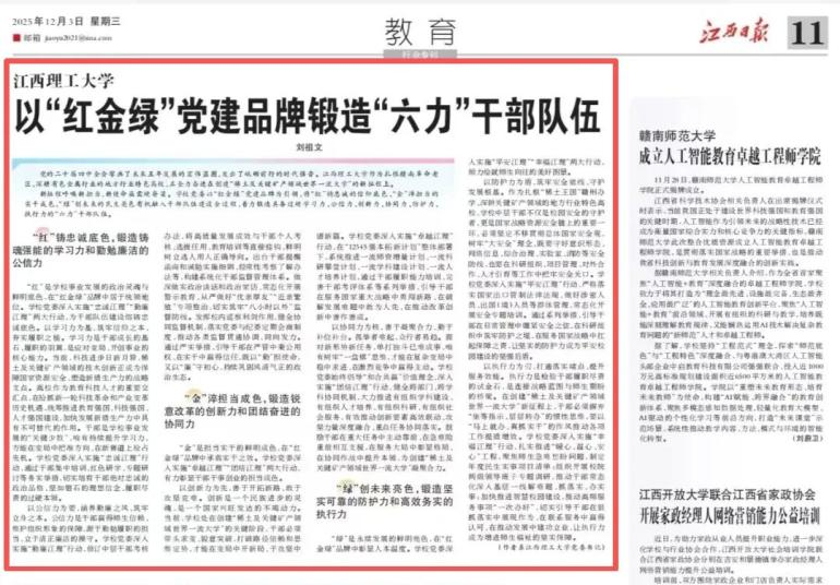 12月3日,《江西日报》教育版头条刊发校党委书记刘祖文教授署名文章《江西理工大学以“红金绿”党建品牌锻造“六力”干部队伍》,新华网同步刊发。