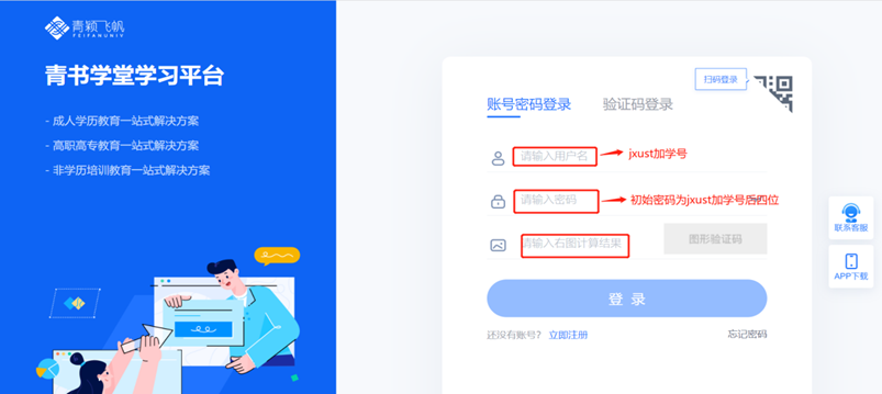 1.点击右上角“登录”进入登录界面如图1所示,登录账号,可使用账号密码进行登录(账号为jxust加学号,初始密码为jxust加学号后四位),如若绑定手机号可使用手机号码进行登录。