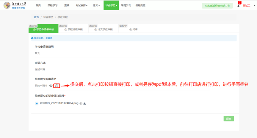 4. 提交后下载打印学位申请表(见图4、图5),线下手写签名( 一式两份,签好字后将表上交至所属教学点或班主任),点击打印按钮保存学位申请书PDF版本。