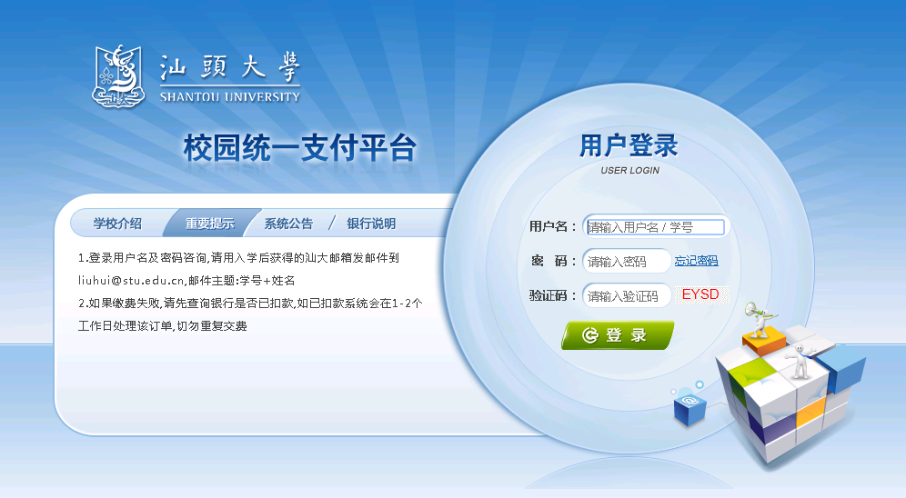 1.登陆“汕头大学校园统一支付平台系统”(网址:pay.stu.edu.cn) 。用户名为学号,初始密码为Stu!+身份证号后六位,或者Stu!+学号