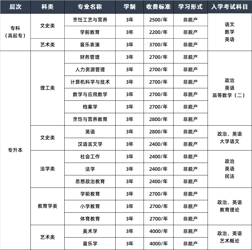 专升本:汉语言文学,思想政治教育,法学,数学与应用数学,体育教育,学前教育,小学教育,计算机科学与技术,音乐学,英语,烹饪与营养教育,人力资源管理,档案学,社会工作,财务管理,美术学