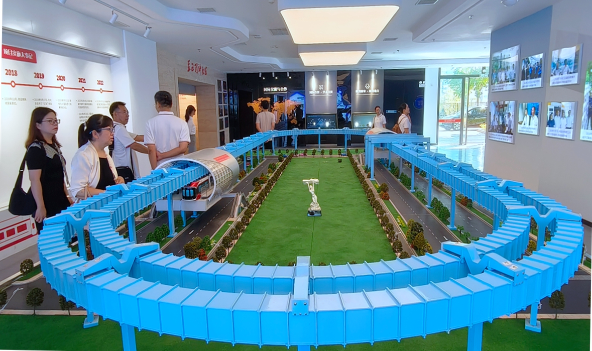 三江校区:在校史馆泛黄的合影前驻足,科技创新馆的尖端成果引来阵阵惊叹,“看!这是永磁悬浮技术应用于空轨车辆模型!一种新型悬挂式磁浮车辆”江丽指着学校最新科研成果激动不已。