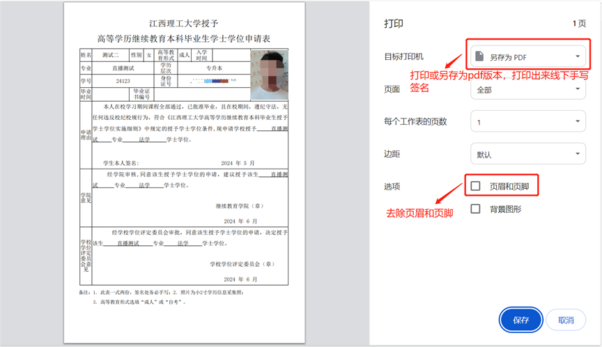 4. 提交后下载打印学位申请表(见图4、图5),线下手写签名( 一式两份,签好字后将表上交至所属教学点或班主任),点击打印按钮保存学位申请书PDF版本。