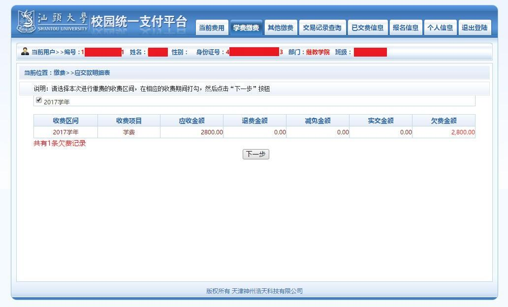 5.再次确认缴费信息无误后,点击“下一步”
