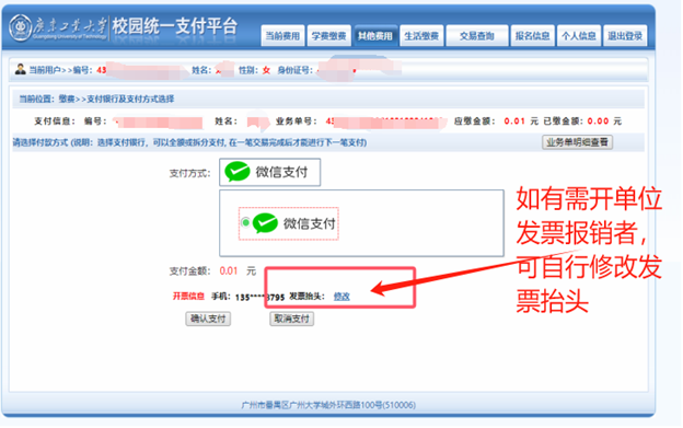 B.选择微信支付方式(如图2-3所示),如电子票据需开单位报销的请修改开票信息(默认交款人是学生姓名)。