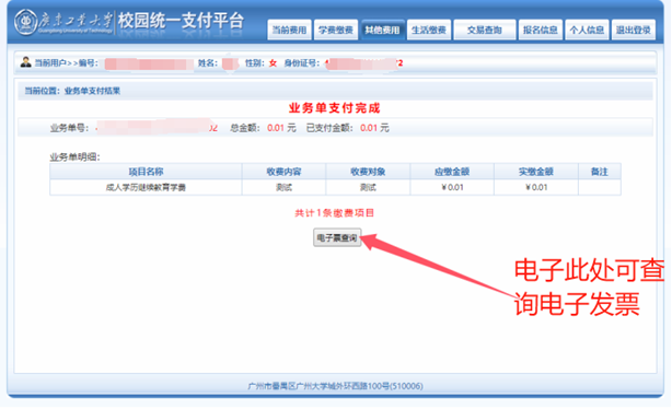 完成支付后,进入“业务单支付结果”页面,点击“电子票查询”按钮即可查看发票图2-5,图2-6是票据信息