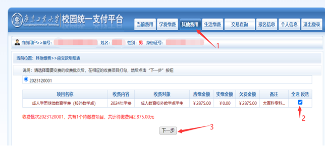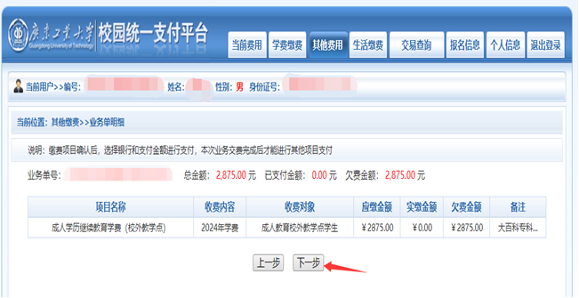 A.点击下一步,显示确认缴费信息(如图2-2所示),再次核实收费内容是否正确,无误,点击“下一步”选择支付方式