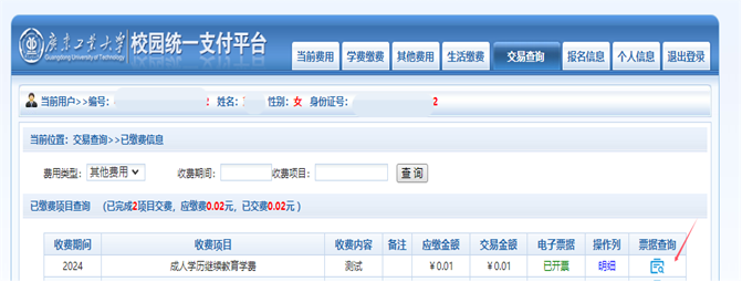 点击导航栏的“交易查询”按钮,可查询“银行缴费记录”和“已缴费信息”,费用类型选择“其他费用”可查询成教已缴学费情况(如图3-1)。点击“明细”可以查询具体的缴费项目等信息,点击“票据查询”也可查看电子票据。