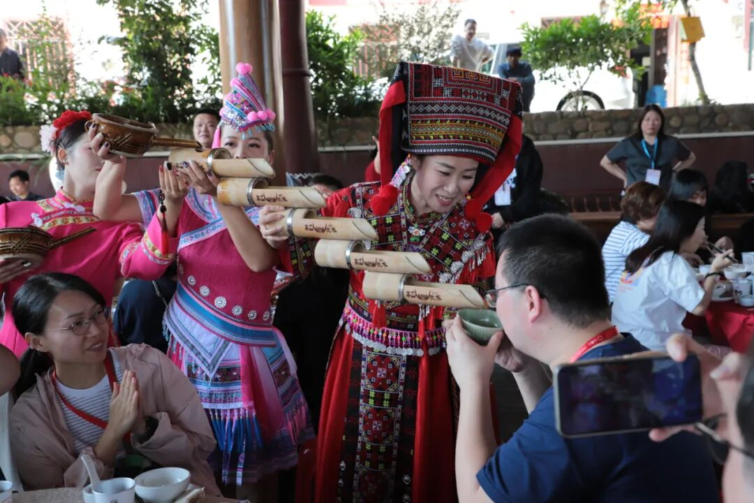 在瑶族特色长桌宴上,交流团成员一边品尝当地独具风味的特色美食,一边欣赏精彩的瑶族文化展演;现场还设有丰富的农特产品展销区,琳琅满目的地方特产吸引了香港社工朋友们驻足了解。这些生动的体验让香港同胞对乳源当地民俗文化有了更直观的感受。