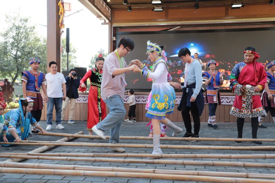与此同时,展演活动同样精彩纷呈,多个富有特色的节目轮番上演——展现瑶族劳动场景的开场舞《嗒炅》,以树叶为乐器的独特演奏《请到乳源瑶山来》,展现非遗文化的双人变脸《变的魅力》,以及表达民族团结美好愿景的歌舞《民族团结花盛开》等节目轮番上演。演出结束后,竹竿舞互动环节更是引发了全场参与的热情,两地同胞随着欢快的节奏共同起舞,在互动中增进了情谊,真切体现了“心连心”的活动主题。
