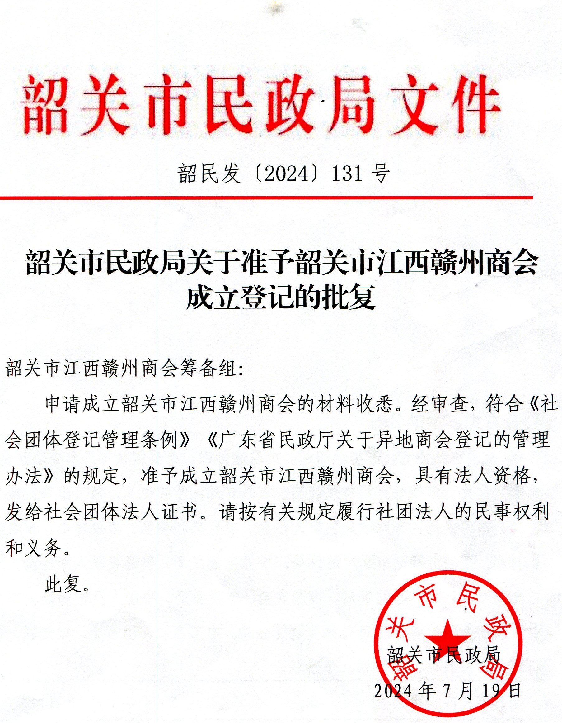 首页>> 韶关赣州商会>>韶关市江西赣州商会成立登记•市民政局批复准予注册 法人资格20240719